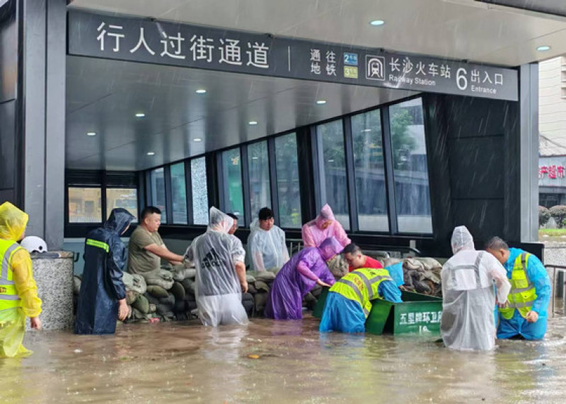 沙袋在火车站地铁6号出入口筑起坚固防线
