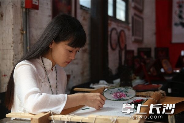 “湘绣熟能生巧,不仅要拼耐心,还得拼悟性。”周亚向前来参观的游客介绍湘绣诀窍。“湘绣艺术巧夺天工,细密的针脚勾勒出栩栩如生的各种造型,真是美呆了。”一幅幅形态迥异的湘绣让广州的孟燕女士流连忘返,她还兴趣盎然地拿起了锈针,现场体验湘绣绝技绝活,过了一把“绣娘瘾”。“油纸伞也别有一番情趣。”曾多次前往长沙游玩,一江两岸山水洲城之美给孟女士留下了深刻印象。她欣然拿起手机,在油纸伞前拍照留念,用镜头定格最美瞬间。