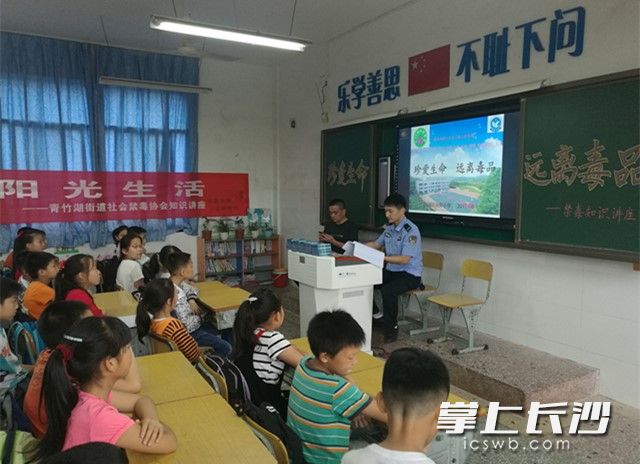 开福区社会禁毒协会青竹湖分会会长卢戒三老师走进课堂,为学生带来了一堂题为“珍爱生命,远离毒品”的专题讲座;青竹湖街道综治办禁毒专干鄢刚,向学生分发了禁毒宣传资料;青竹湖派出所民警谭勇在现场详细地跟孩子讲解禁毒法律知识、毒品的危害,作为社会成员参与禁毒的责任等,进一步提高孩子对毒品危害的认识,增强禁毒防毒意识,扩大禁毒宣传影响力。
