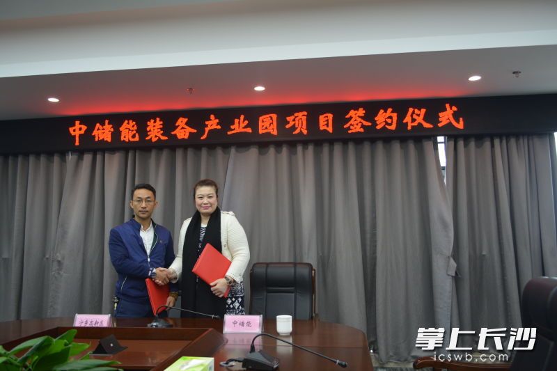宁乡高新区党工委副书记、管委会主任苏继桃与湖南中储能材料集团有限公司董事长高俪庭签约。