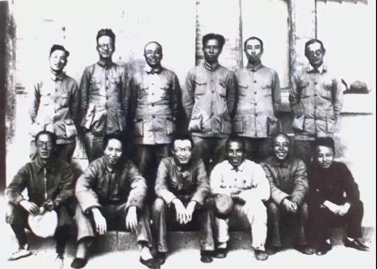 ▲1938年,中共中央主要领导人在延安合影。前排左起:康生、毛泽东、王稼祥、朱德、项英、王明;后排左起:陈云、博古、彭德怀、刘少奇、周恩来、张闻天。