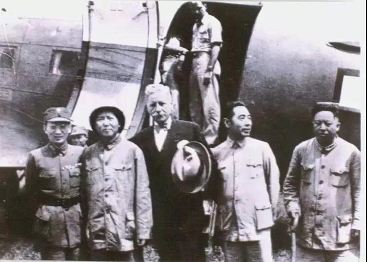 ▲1945年8月,中共代表毛泽东、周恩来、王若飞应蒋介石的邀请,赴重庆同国民党谈判。图为中共代表离开延安前,与专程前来迎接的美国驻华大使赫尔利(中)、国民党代表张治中合影。