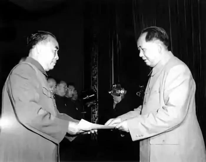 ▲1955年9月27日,毛泽东颁发授予朱德等中华人民共和国元帅军衔的命令状。