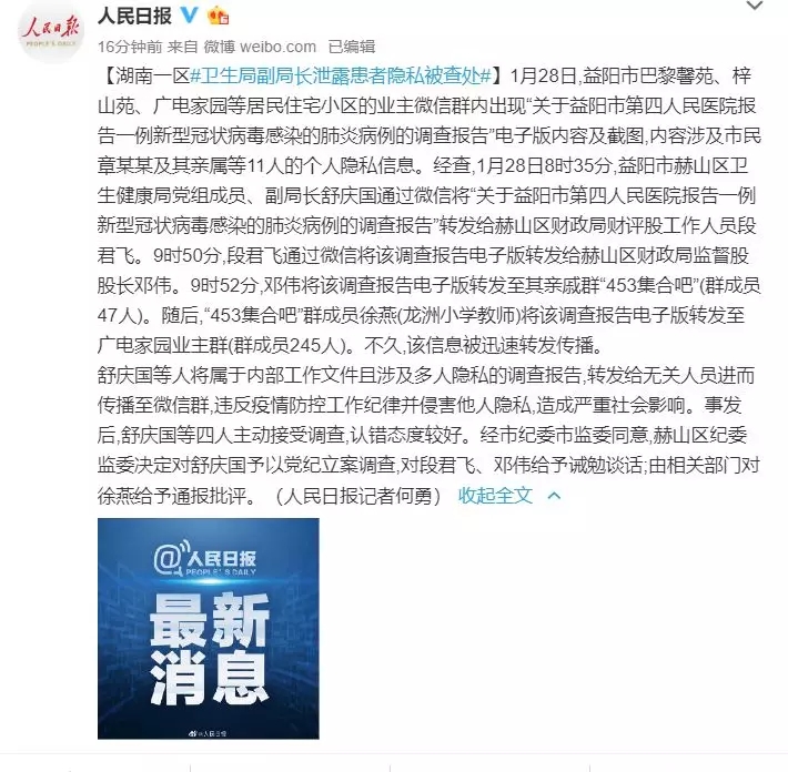 经查,1月28日8时35分,益阳市赫山区卫生健康局党组成员、副局长舒庆国通过微信将“关于益阳市第四人民医院报告一例新型冠状病毒感染的肺炎病例的调查报告”转发给赫山区财政局财评股工作人员段君飞。