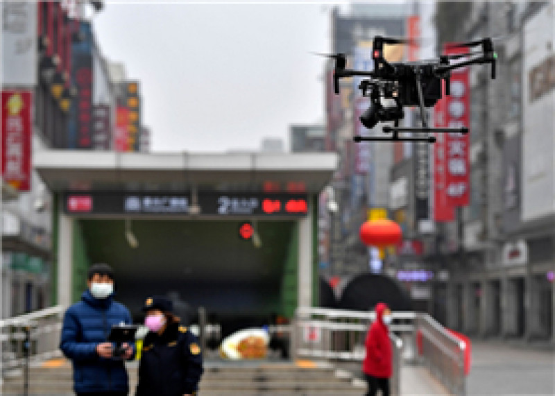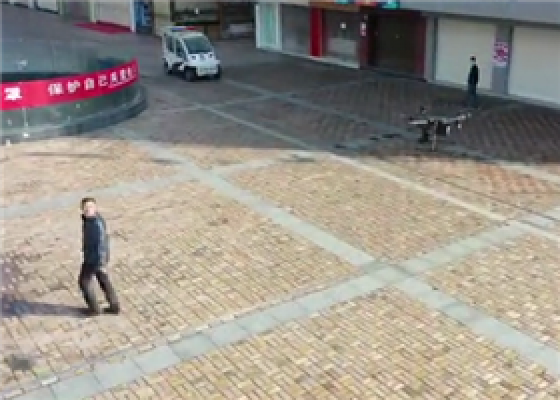 队员们提前抵达汽车北站,进行作业前准备。在告知作业区域内居民作业情况且确保地面没有无关人员后,抗击疫情无人机徐徐升空,喷洒消毒剂。队员们一边操控无人机作业,一边疏散周边围观群众,确保作业绝对安全。