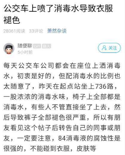 长沙晚报掌上长沙2月28日讯 据杭州日报、萧内网萧山论坛消息 现在,只要到公共场所,经常能闻到消毒水的味道。尤其是人群密集的交通工具上,做消毒十分有必要。