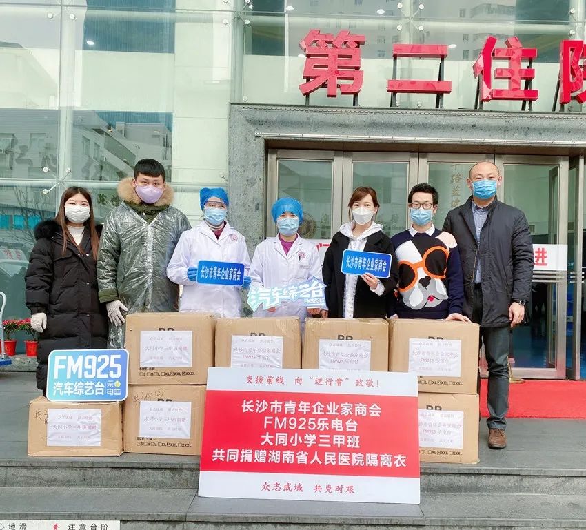 长沙晚报掌上长沙3月6日讯 3月4日上午九点钟,湖南省人民医院第二住院楼前,显得有些“热闹”。原来,是大同小学三甲班和长沙市青年企业家商会的代表给医护人员送隔离服来了!