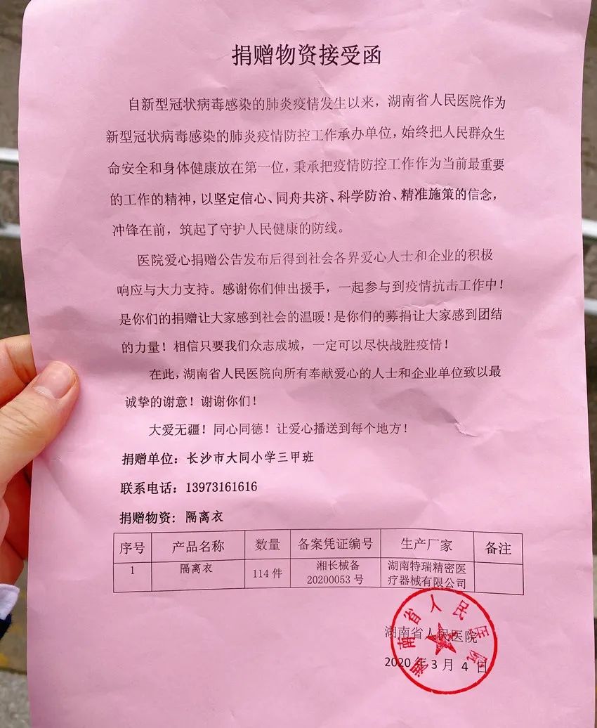 当班主任老师把盖着“湖南省人民医院”红色公章的接受函拍照发在班级群,大同小学三甲班的孩子们都乐开了花,孩子们说:”发生疫情以来,是你们这些白衣天使在前方保护我们,也请你们保护好自己,感谢你们。”