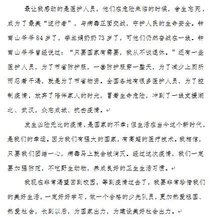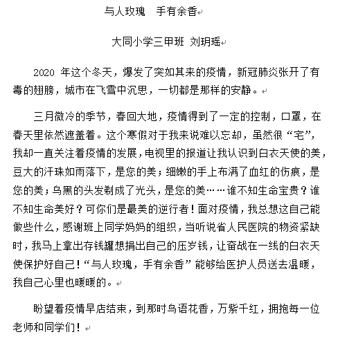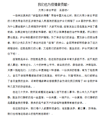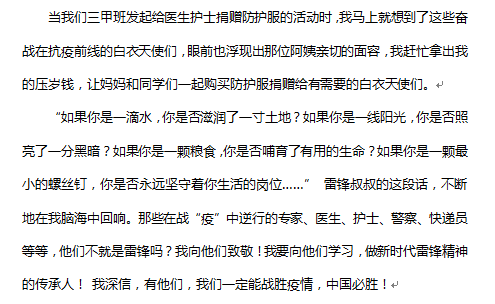 没有强大的国,就没有幸福的家,个人命运同国家命运紧密相连,培养爱国主义就是要坚持从娃娃抓起。对于学生而言,一位传道授业的良师,会让人终生难忘;一堂触碰心灵的好课,会让人终身受益。当前战“疫”既是一场大考,也是一堂“大课”,万众一心、和衷共济,众志成城的感人场景不断涌现,这无疑是一堂鲜活生动、鼓舞人心的思政课。三甲班把学校小课堂和社会大课堂紧密结合,组织同学们捐赠医疗物质,为抗击疫情贡献力量,就是一堂生动的思想道德教育课,更能让孩子们在关键事件的淬炼中磨砺成长,用战“疫”激发担当意识和家国情怀,增强团结一心的精神纽带,凝聚起战“疫”必胜的信心和决心,为学生们打开了一扇扇窗,让爱国之情根植灵魂。