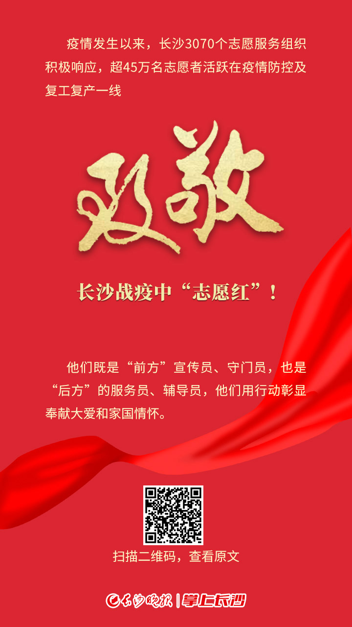 聚则一团火、散则满天星。爱心捐助、检查登记、政策宣讲、物资分发、心理疏导、物品代购……疫情发生以来,长沙3070个志愿服务组织积极响应,超45万名志愿者活跃在疫情防控及复工复产一线。这些工作不一、年龄不一、经历不一的志愿者,在疫情面前有一个共同的心愿:共克时艰,为战“疫”出一份力。