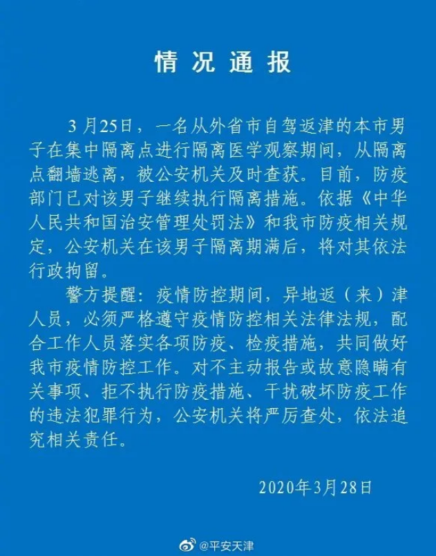 长沙晚报掌上长沙3月29日讯 据天津市公安局官方微博@平安天津 3月28日通报,3月25日,一名从外省市自驾返津的男子在集中隔离点进行隔离医学观察期间,从隔离点翻墙逃离,被公安机关及时查获。目前,防疫部门已对该男子继续执行隔离措施。依据《中华人民共和国治安管理处罚法》和天津市防疫相关规定,公安机关在该男子隔离期满后,将对其依法行政拘留。