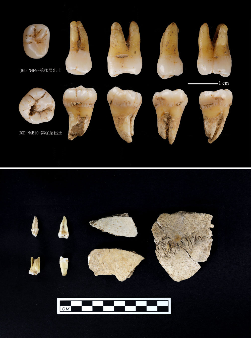 ↑陕西南郑疥疙洞旧石器时代洞穴遗址出土的人类牙齿和头骨残块(拼板资料照片)。
