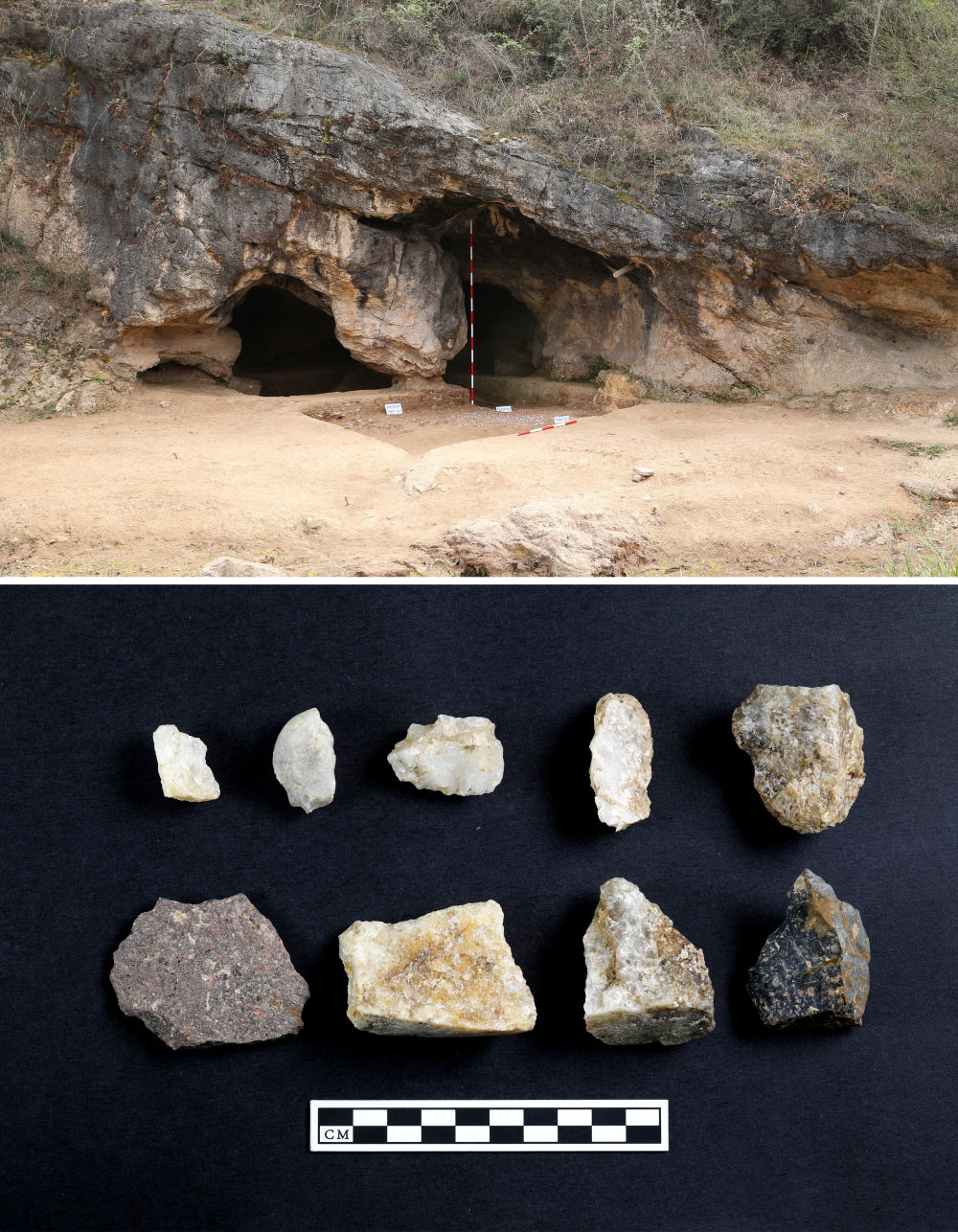 ↑陕西南郑疥疙洞旧石器时代洞穴遗址近景(上图)、疥疙洞遗址出土的石制品(下图)(拼板资料照片)。
