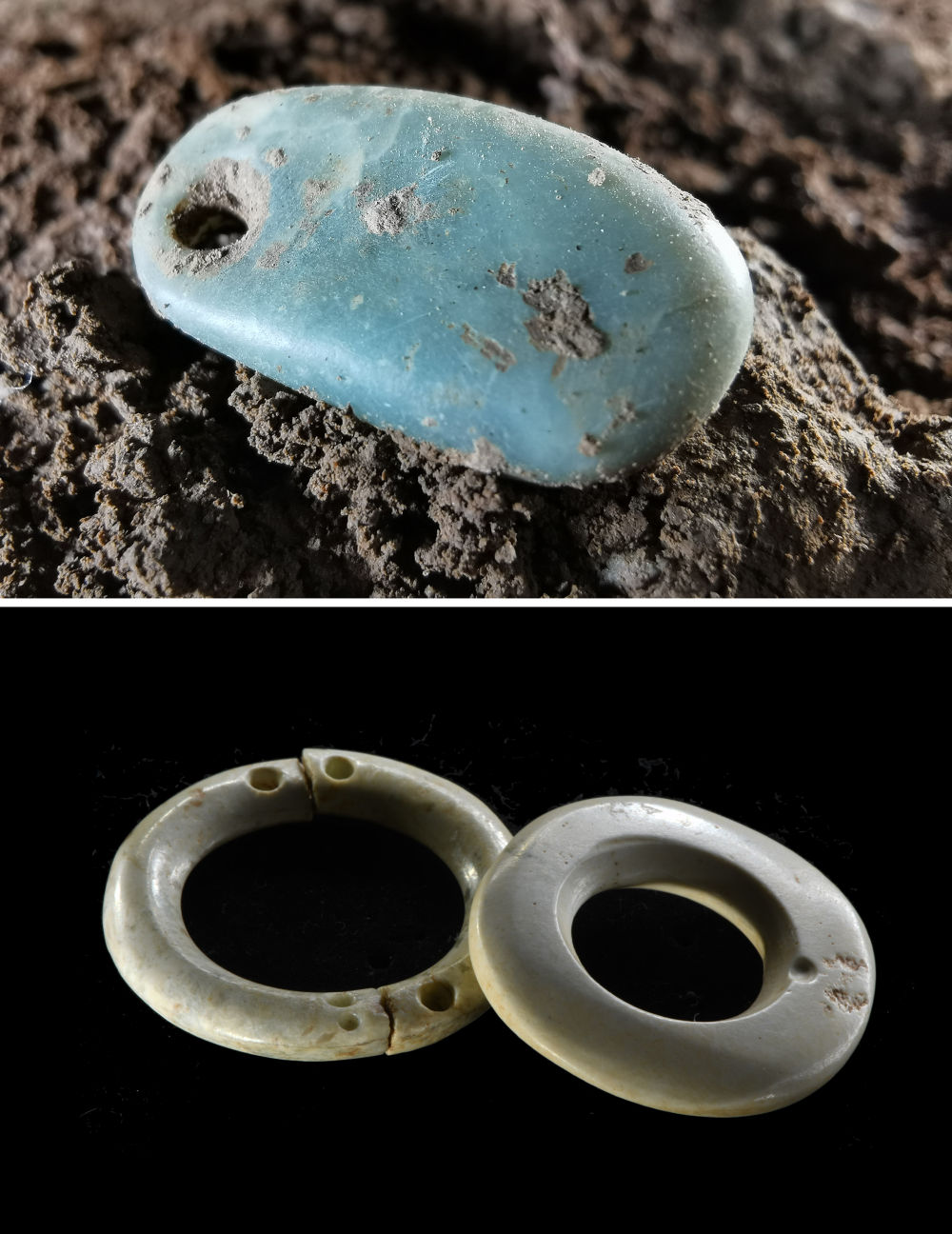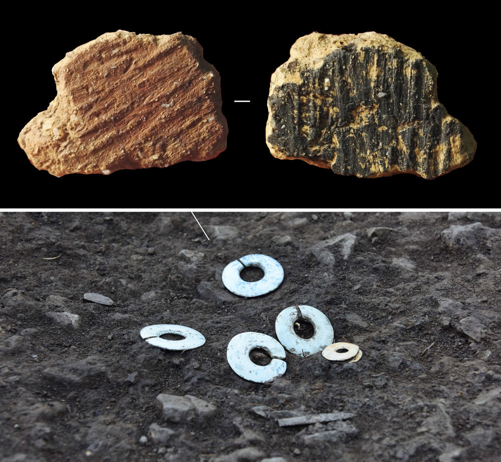 ↑黑龙江饶河小南山遗址出土的早期陶片(上图)和墓葬出土的玉器(下图)(拼板资料照片)。