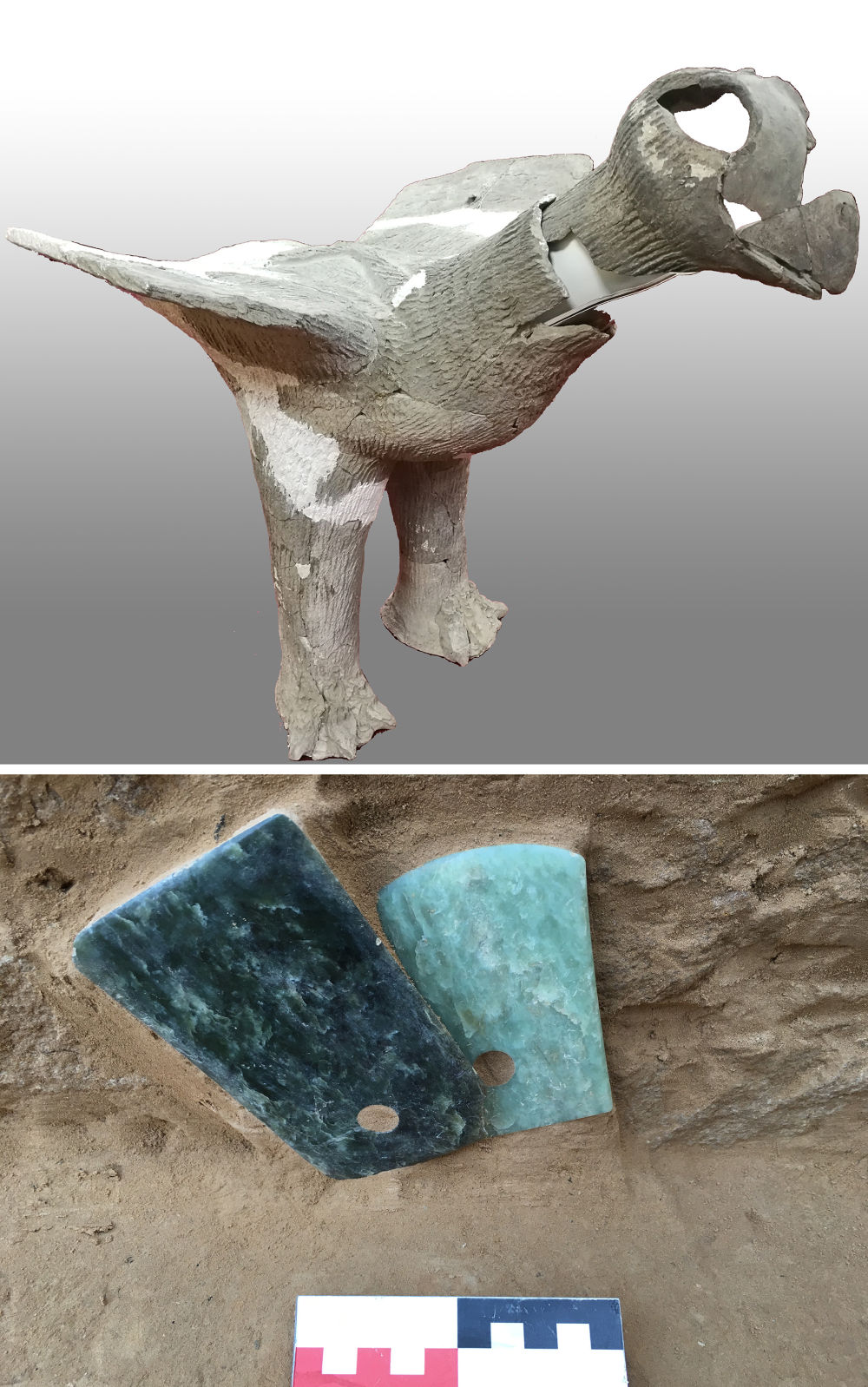 ↑陕西神木石峁遗址皇城台出土的陶鹰(上图)和玉钺(下图)(拼板资料照片)。