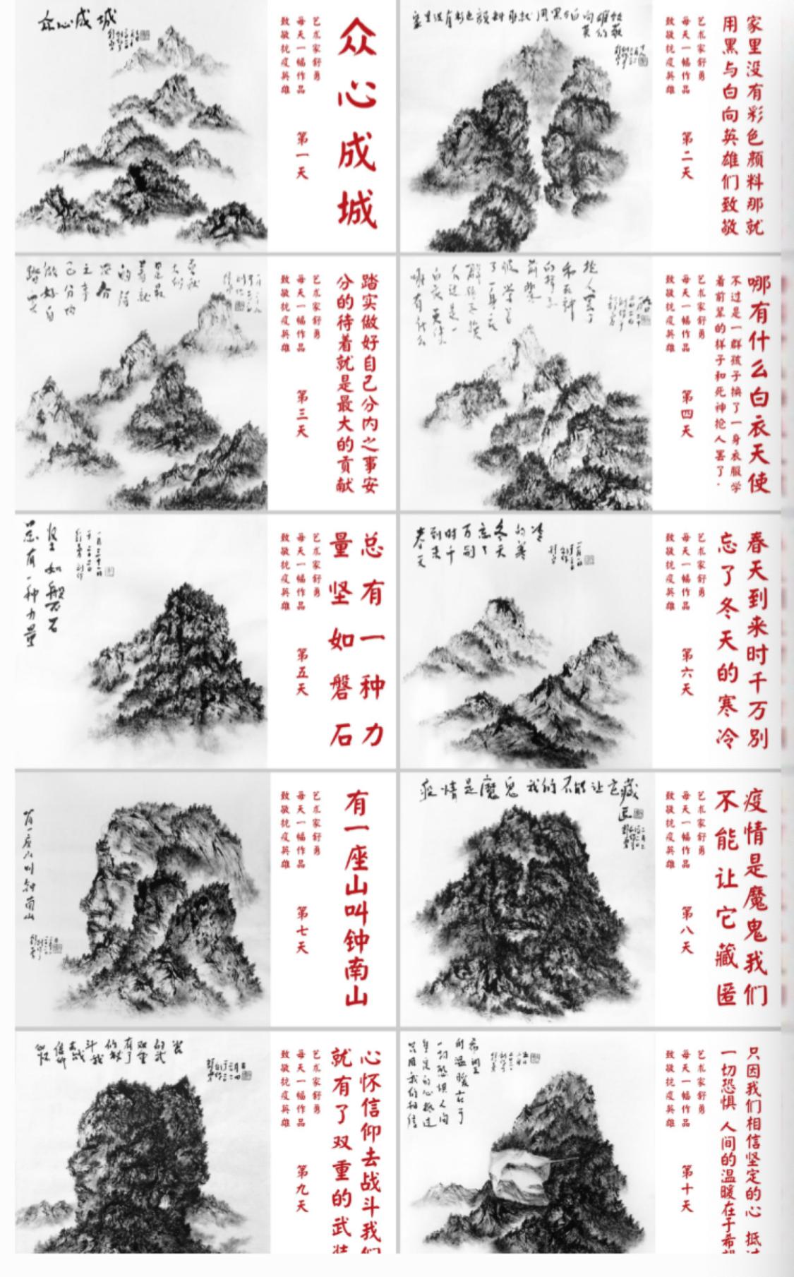 答:抗疫是一场人民的战争,我们只有万众一心,才能够真正打赢这场人民战争。在这场全民防疫的人民战争中,中国人民必胜,也必将在这个过程中形成伟大的民族精神,而这种精神值得记录与纪念。艺术不仅仅是个人的修行,要有时代感和使命感,我作为一名文艺工作者,也是时代精神的传颂人,所以必然要以创作方式与许多社会力量一起,加入到对这场灾难的抗争中,系统思考个体与自然、与民族、与国家以及世界之间,应该如何构建一个健康的价值观体系。艺术家应该用自己的悲悯去秉承心忧天下的家国情怀,坚持艺术良心与艺术理想,椎心泣血,精益求精,创作出真正的好作品。以“山”来表示人民意向与战胜病魔的坚定信仰,是我的艺术语言。通过符号的引入把中国传统山水画直接引入到当代语境,使其真正成为具有现实意义的当代艺术。“山与人结合,还源于中国的‘天人合一’思想,人与自然应该互相尊重,互为后盾。命运共同体的建立,首先应该是健康共同体,那就必须懂得和自然界、和野生动物和谐相处,对自然有敬畏之心。当我的艺术和国家放在一起的时候,也打开了我的格局。我的艺术不断地让我打开自己的胸怀,进而建立更高的格局。