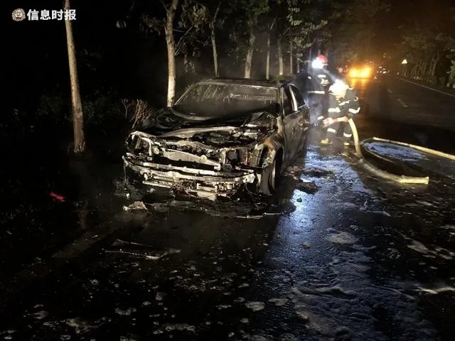 经侦查,小车自燃着火,停靠在路边,火势正处于猛烈燃烧阶段,且附近有密集的树林,情况十分危急。消防员经过20分钟的努力,明火基本被扑灭,由于扑救及时,没有造成人员伤亡和重大财产损失。