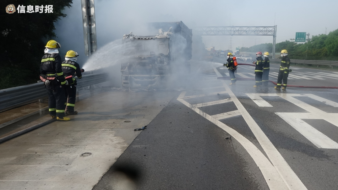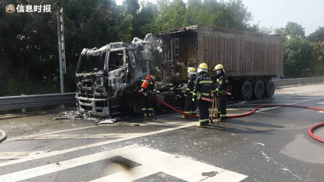 5月17日08时24分许,一辆泥头车在广澳高速行驶途中,车头部位突然冒出白烟和火苗。随后泥头车立即变道靠到马路右侧,那时车头已经蹿出明火,而且越烧越大。