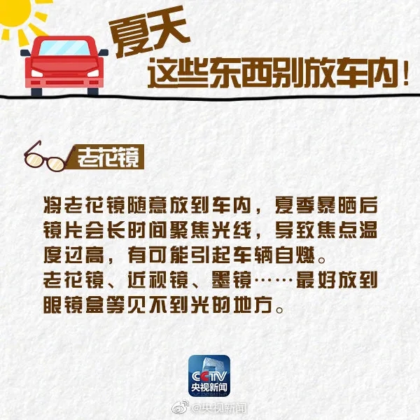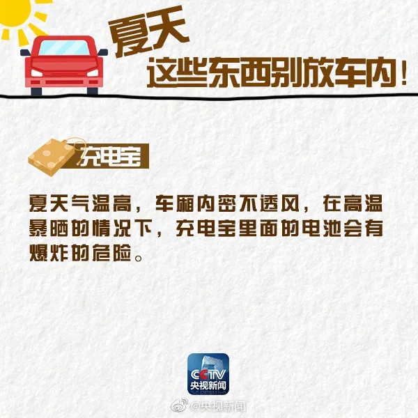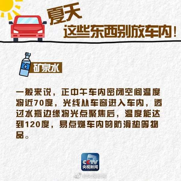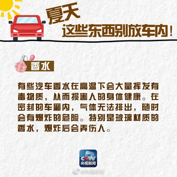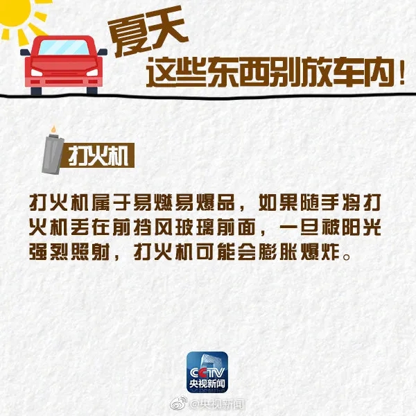 最后,车主不要在车内存放危险品,如打火机、香水、摩丝等易燃品,普通车辆更不要装载汽油、柴油等危险油品。