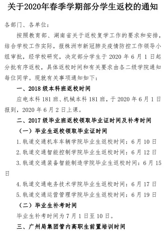毕业班学生于2020年6月15日起分批错峰返校复学。所有肄业班学生本期暂不返校,继续实施线上教学。疫情高风险地区和其他有特殊情况的毕业班学生可向学校申请暂缓返校。