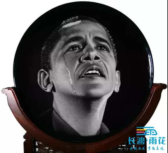 看过木版印制,看过竹编、棕编,看过这里那里。我们走进了一间瓷刻工作室。我们大家的眼球,顷刻间就被挂在墙上的几件展品吸引住了。无论是名人还是凡人,生动逼人。你看奥巴马眼皮下面的那滴泪水,你看跳水运动员脸上的水珠,多么逼真。似乎是真的有泪粒、有水珠在脸上。我忍不住用手去摸了一下。看上去是凸出来的水珠,手触上去你才知道,其实是凹下去的。那人物脸上的胡须、眉毛,明朗、清晰,似乎还在微微抖动,非常有质感!有一件作品,标了一个价:90万元。这价真高,一想,也还真值!