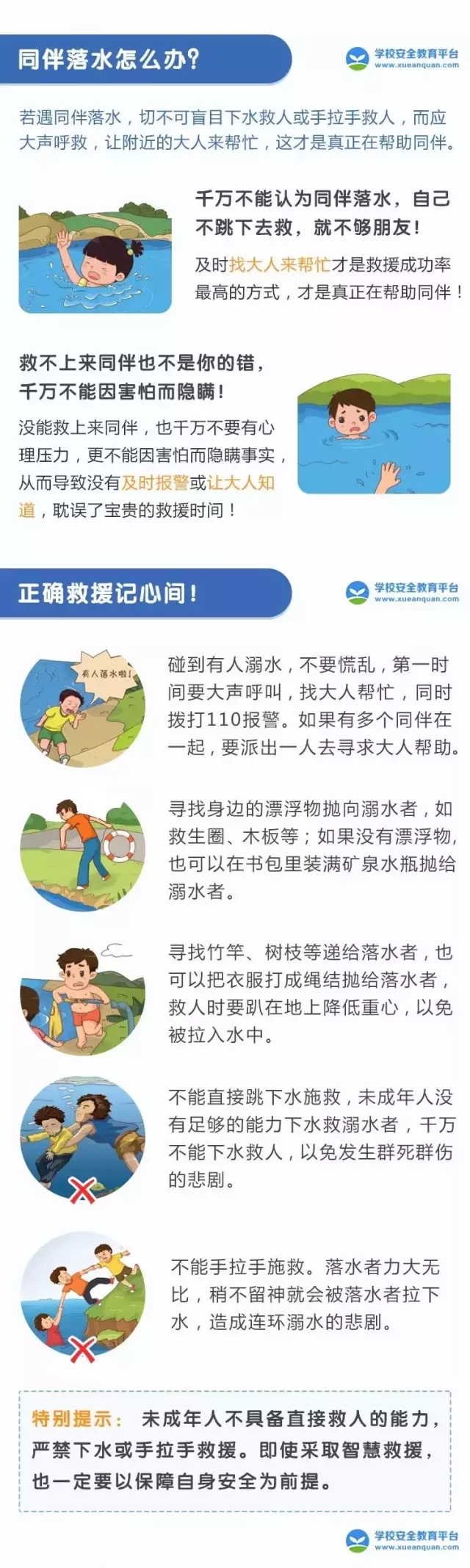 再次提醒!所有人都要注意!看到有人落水千万不要跳下去营救!千万不要正面拽行!可以使用长竹竿、抛漂浮物、喊大人…千万不要仗着自己水性好就掉以轻心!