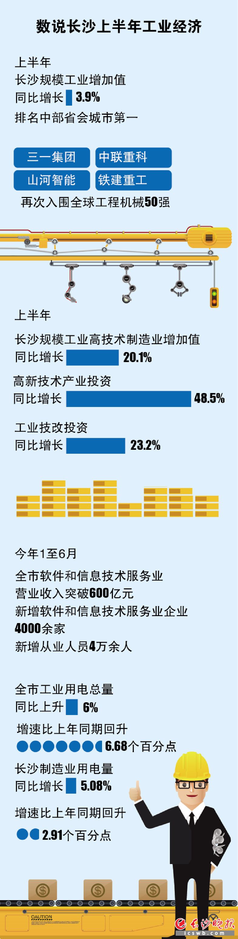 数据显示,今年上半年,长沙规模工业高技术制造业增加值同比增长20.1%,高新技术产业投资同比增长48.5%,高于全市投资增速44.5个百分点;工业技改投资同比增长23.2%,高于全市投资增速19.2个百分点,居中部六省会城市第一位和全省第一位。