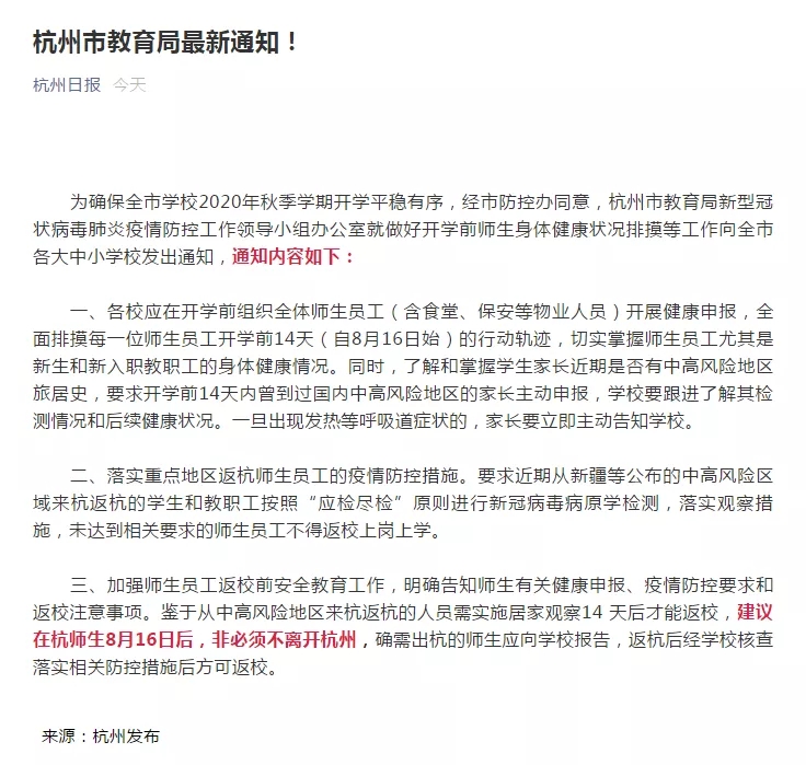 杭州市教育局建议,在杭师生8月16日后,非必须不离开杭州,确需出杭的师生应向学校报告,返杭后经学校核查落实相关防控措施后方可返校。