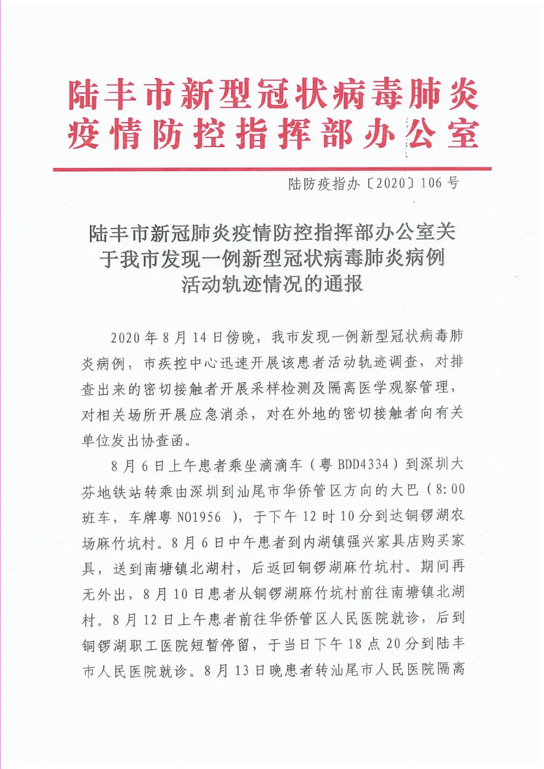 通报称,8月6日上午患者乘坐滴滴车(粤bdd4334)到深圳大芬地铁站转乘由深圳到汕尾市华侨管区方向的大巴(8:00班车,车牌粤n01956),于下午12时10分到达铜锣湖农场麻竹坑村。