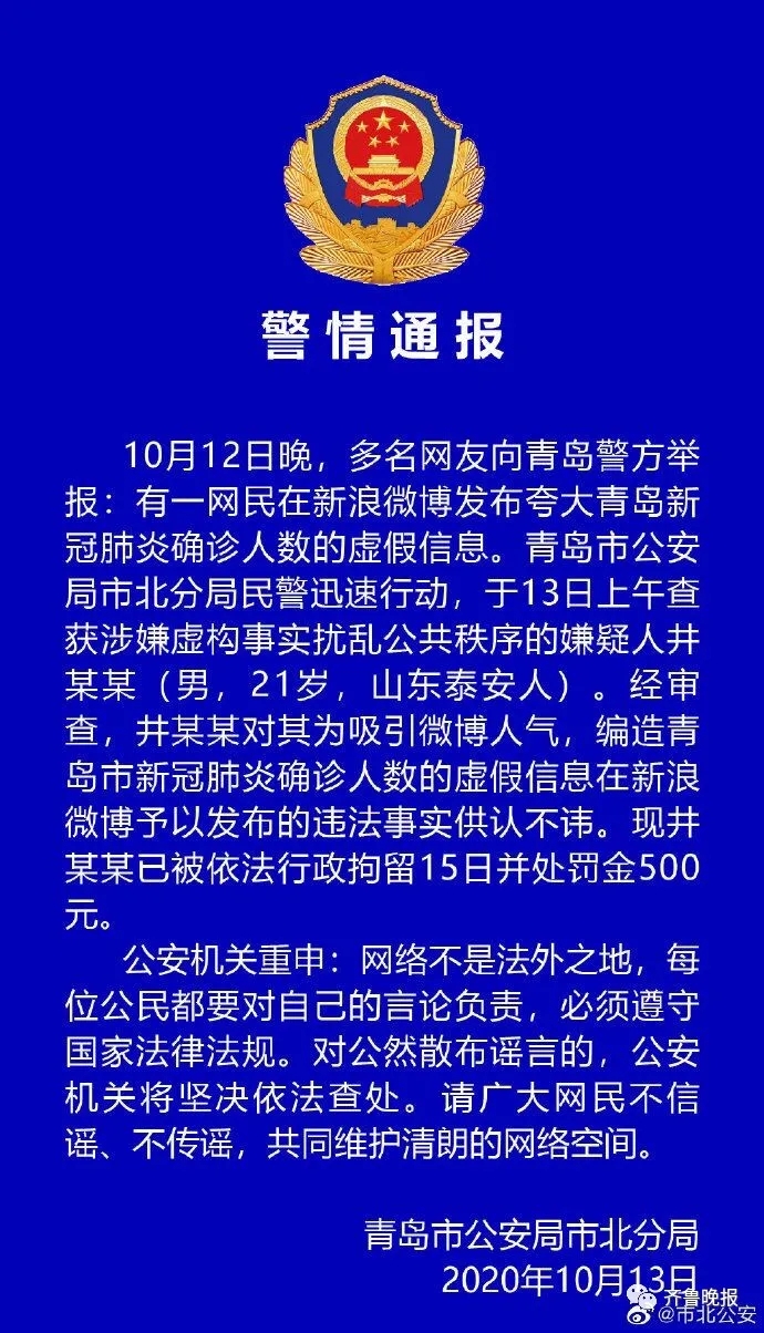 造谣夸大青岛新冠肺炎确诊人数,21岁男子被行拘-九游网址 稿源:@市北公安2020-10-13 18:39 您的浏览器不支持 audio 标签。 长沙晚报掌上长沙10月13日讯 据@市北公安 13日通报,10月12日晚,多名网友向青岛警方举报:有一网民在微博发布夸大青岛新冠肺炎确诊人数的虚假信息。13日,该嫌疑人井某某(男,21岁,山东泰安人)被查获。 经审查,井某某对其为吸引微博人气,编造虚假信息的违法事实供认不讳。目前,井某某已被依法行政拘留15日并处罚金500元。 【作者:】 【编辑:刘天乐】 长沙晚报社九游网址的版权声明 关键词:辟谣 青岛>>我要举报