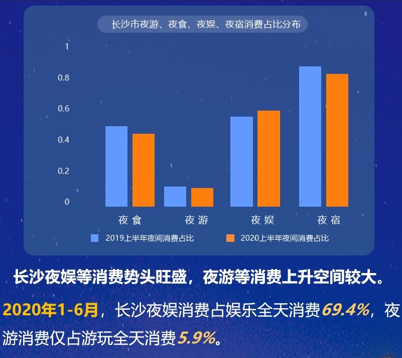 《报告》显示,2020年长沙夜经济呈现出v型反弹的曲线图。疫情爆发后,夜娱、夜游、夜食、夜宿消费均降至冰点,随着疫情防控形势逐渐向好,长沙成为全国率先恢复夜间活力的城市之一,其中,夜娱等消费势头旺盛,夜游等消费上升空间较大。