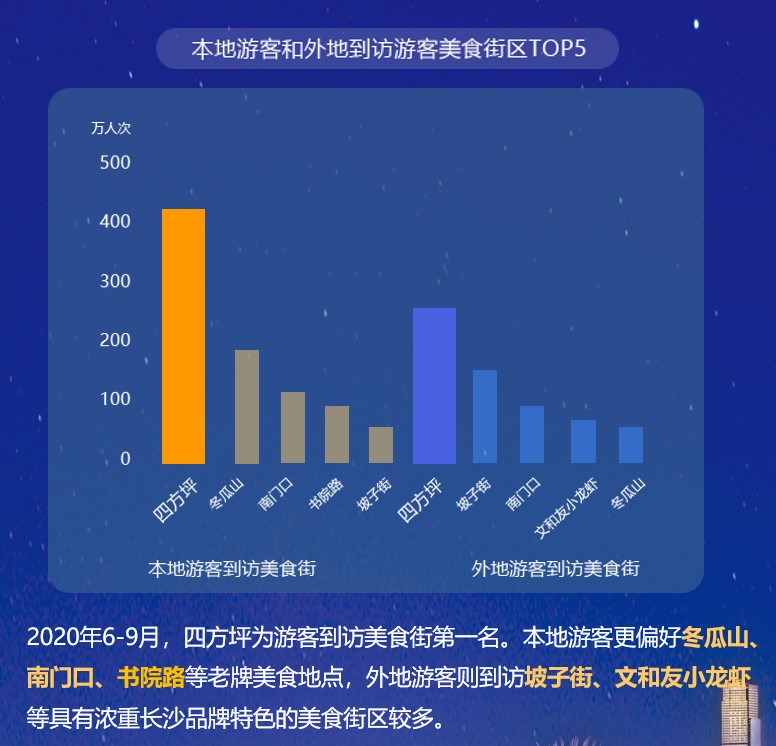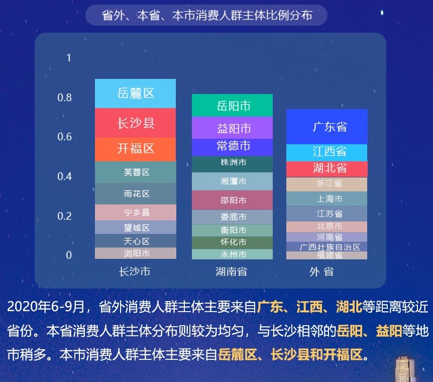 《报告》由长沙市数据资源管理局牵头制作发布,依托目前在建的长沙城市超级大脑数据中台,同时拉取美团、携程旅行网、百度和湖南移动等生活服务性平台数据,从长沙城市夜经济整体情况、主体结构、人气商圈、夜宿品质、夜食街区、夜娱文化、夜游景区等维度开展了数据分析,是首份由官方发布的长沙城市夜经济大数据报告。