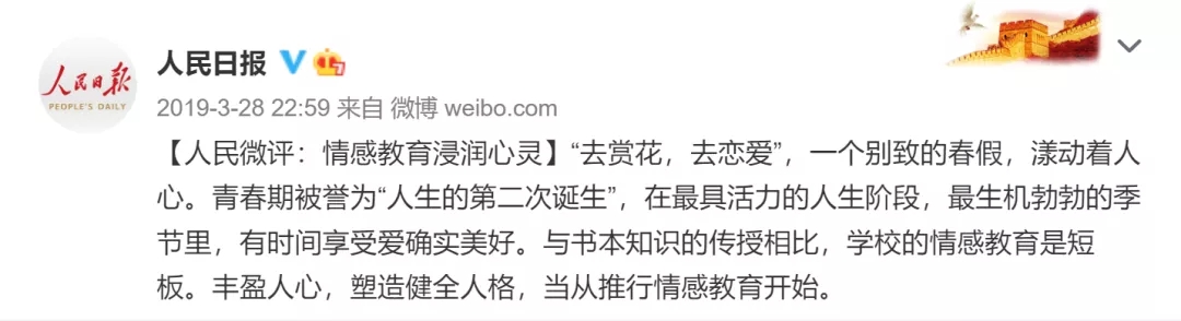 对此,人民日报评论称,“去赏花,去恋爱”,一个别致的春假,漾动着人心。青春期被誉为“人生的第二次诞生”,在最具活力的人生阶段,最生机勃勃的季节里,有时间享受爱确实美好。与书本知识的传授相比,学校的情感教育是短板。丰盈人心,塑造健全人格,当从推行情感教育开始。