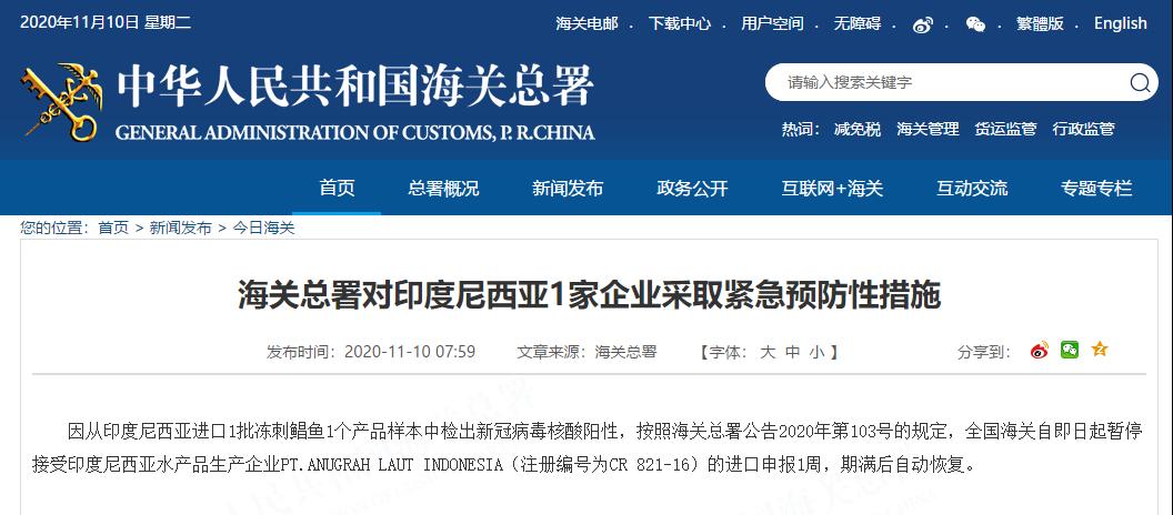 海关总署对印度尼西亚1家企业采取紧急预防性措施-九游网址 稿源:央视新闻2020-11-10 8:18 您的浏览器不支持 audio 标签。 长沙晚报掌上长沙11月10日讯 据央视新闻消息,因从印度尼西亚进口1批冻刺鲳鱼1个产品样本中检出新冠病毒核酸阳性,按照海关总署公告2020年第103号的规定,全国海关自即日起暂停接受印度尼西亚水产品生产企业pt.anugrah laut indonesia(注册编号为cr 821-16)的进口申报1周,期满后自动恢复。 【作者:】 【编辑:易隽】 长沙晚报社九游网址的版权声明 关键词:海关 防疫>>我要举报