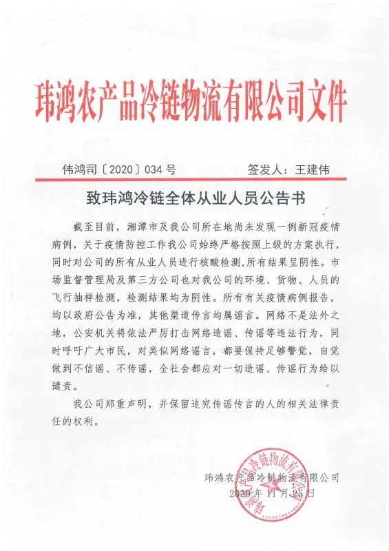11月25日上午,伟鸿食品董事长王建伟以玮鸿农产品冷链物流有限公司的名义,签发了“致玮鸿冷链全体从业人员公告书”。公告书称,截至目前,湘潭市及伟鸿食品所在地尚未发现一例新冠肺炎疫情病例。公司对所有从业人员进行了核酸检测,所有结果呈阴性。市场监督管理局及第三方公司也对公司的环境、货物、人员进行飞行抽样检测,检测结果均为阴性。所有有关疫情病例报告,均以政府公告为准,其他渠道传言均属谣言。伟鸿食品特郑重声明,并保留追究传谣传言人相关法律责任的权利。