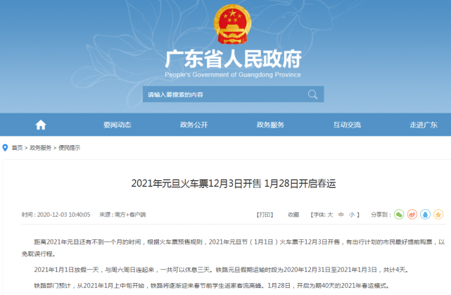 事实上,12月3日,广东省人民政府九游网址官网上发布了《2021年元旦火车票12月3日开售