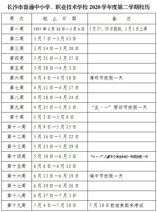 2021年3月1日上课,2021年7月10日结束, 全学期共19周。暑假从2021年7月11日开始,2021年8月28日结束。