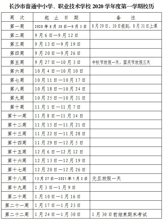 2020年8月31日上课,2021年1月30日结束,全学期共22周。寒假从2021年1月31日开始,2021年2月27日结束。