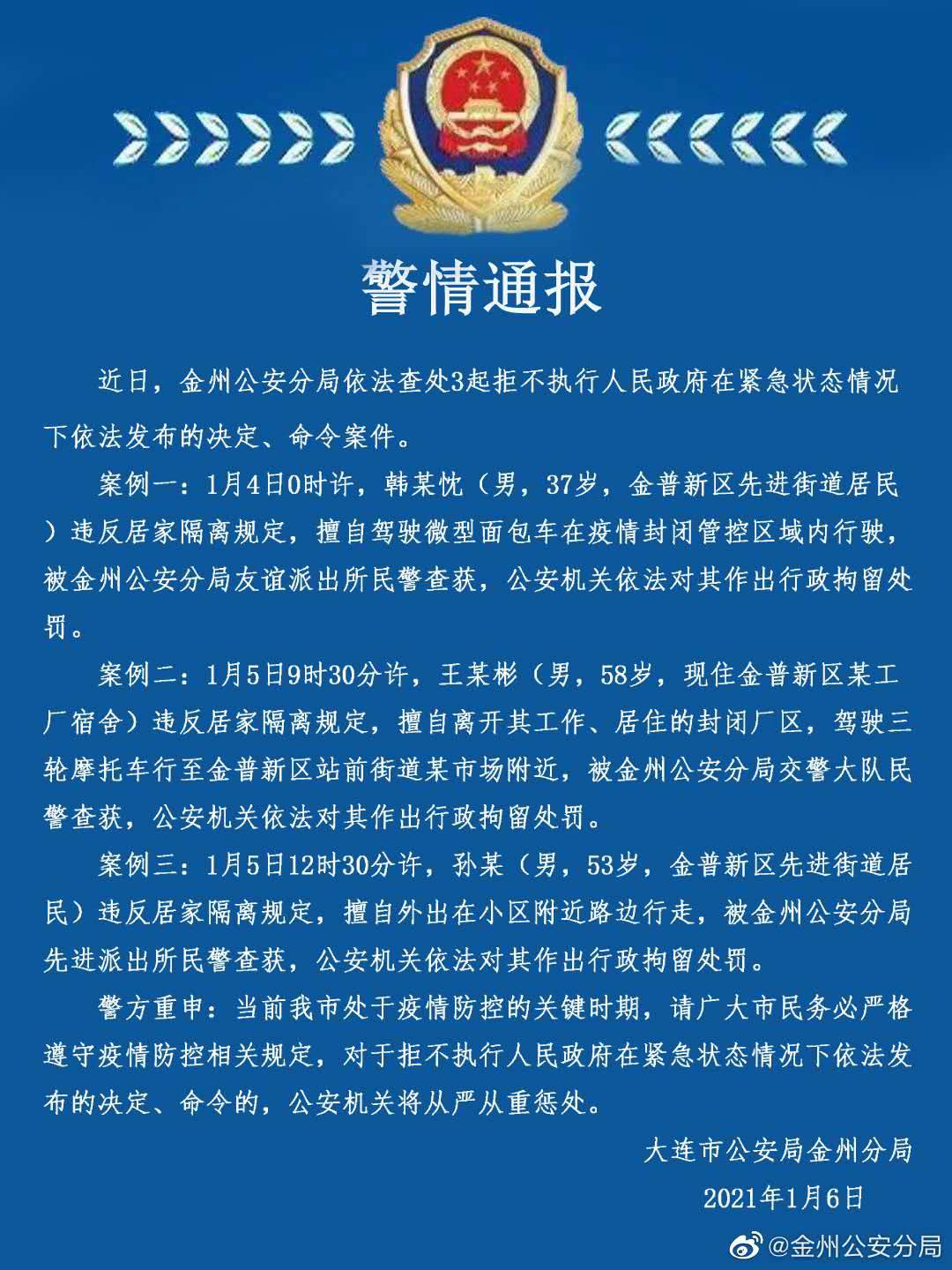 违反居家隔离规定外出,大连3人被拘-九游网址 稿源:人民日报2021-01-06 18:28 您的浏览器不支持 audio 标签。 长沙晚报掌上长沙1月6日讯 据人民日报消息(记者 胡婧怡)记者从大连金州公安分局获悉,近日该局依法查处3起拒不执行人民政府在紧急状态情况下依法发布的决定、命令案件,具体通报如下: 【作者:记者 胡婧怡】 【编辑:刘天乐】 长沙晚报社九游网址的版权声明 关键词:大连 居家隔离 疫情>>我要举报