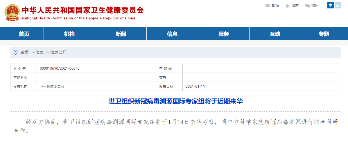 世卫组织新冠病毒溯源国际专家组将于1月14日来华-九游网址 稿源:央视新闻客户端2021-01-11 12:59 您的浏览器不支持 audio 标签。 长沙晚报掌上长沙1月11日讯 据央视新闻客户端消息 国家卫健委官方网站发布消息,世卫组织新冠病毒溯源国际专家组将于1月14日来华。全文如下: 经双方协商,世卫组织新冠病毒溯源国际专家组将于1月14日来华考察,同中方科学家就新冠病毒溯源进行联合科研合作。 【作者:】 【编辑:张日】 长沙晚报社九游网址的版权声明 关键词:新冠病毒溯源 >>我要举报