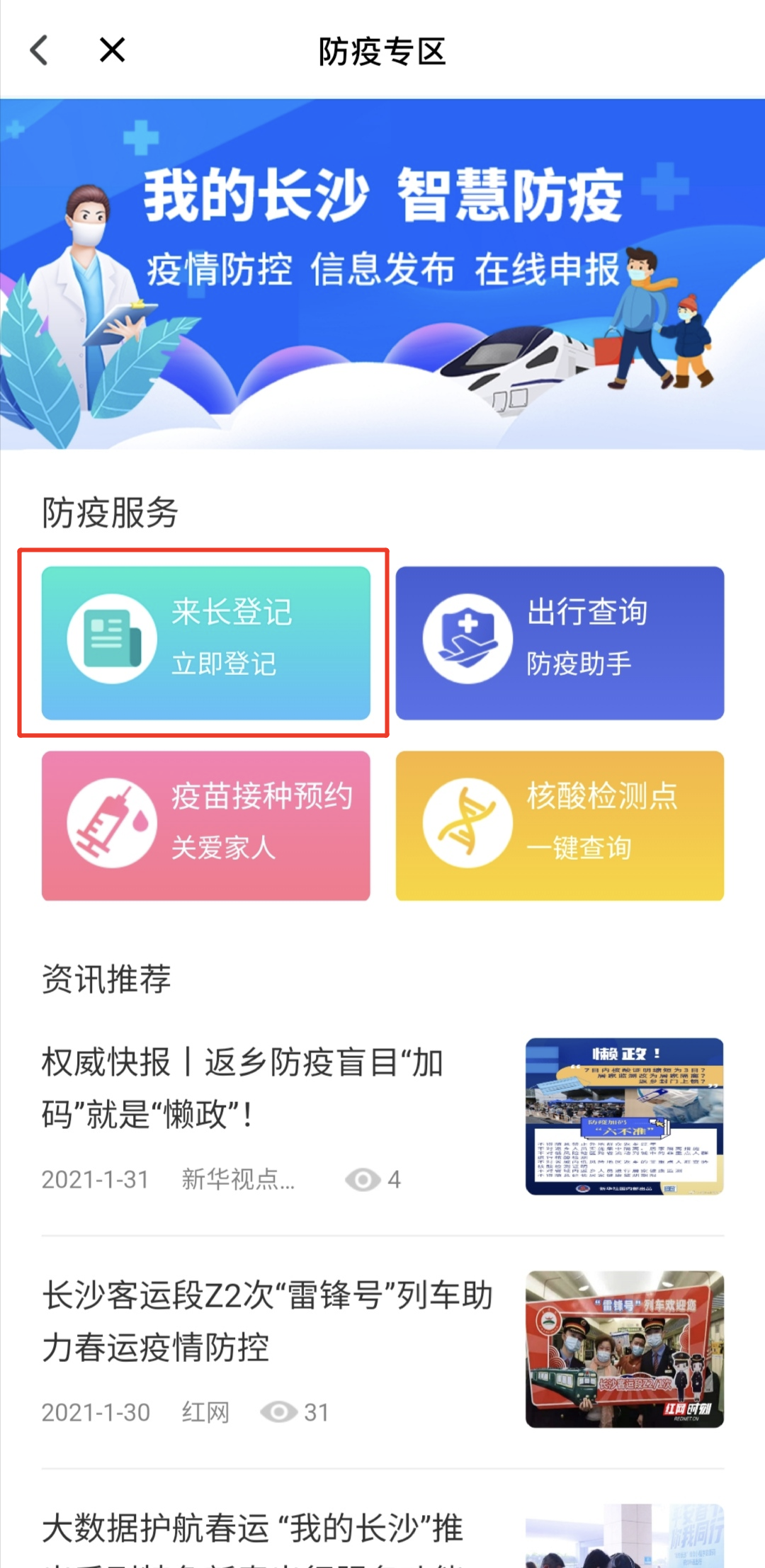 长沙晚报掌上长沙2月3日讯(全媒体记者 吴颖姝 通讯员 周妍)2021春节将至,多地新冠疫情出现反复。近日,长沙市新型冠状病毒肺炎防控指挥部办公室发布“关于进一步明确春运期间低风险地区来(返)长人员疫情防控管理措施的通知”,要求来(返)长人员应主动向社区和村进行申报。记者今日获悉,为全力做好疫情防控工作,长沙市数据资源管理局联合长沙市卫生健康委员会为市民保驾护航,在“我的长沙”推出【防疫专区】,可高效办理在线登记、政策查询等服务,有效减少感染风险,助力智慧防疫。市民可下载“我的长沙”app,或者微信搜索打开“我的长沙”小程序即可指尖办、马上办。