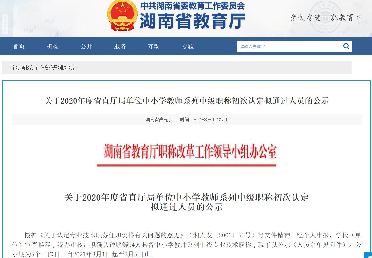 长沙晚报掌上长沙3月2日讯 昨日,湖南省教育厅网站发布2020年度湖南省直厅局单位,中小学教师系列中级职称初次认定拟通过人员的公示。拟确认钟鹏等94人具备中小学教师系列中级专业技术职称,公示期自2021年3月1日起至3月5日止。