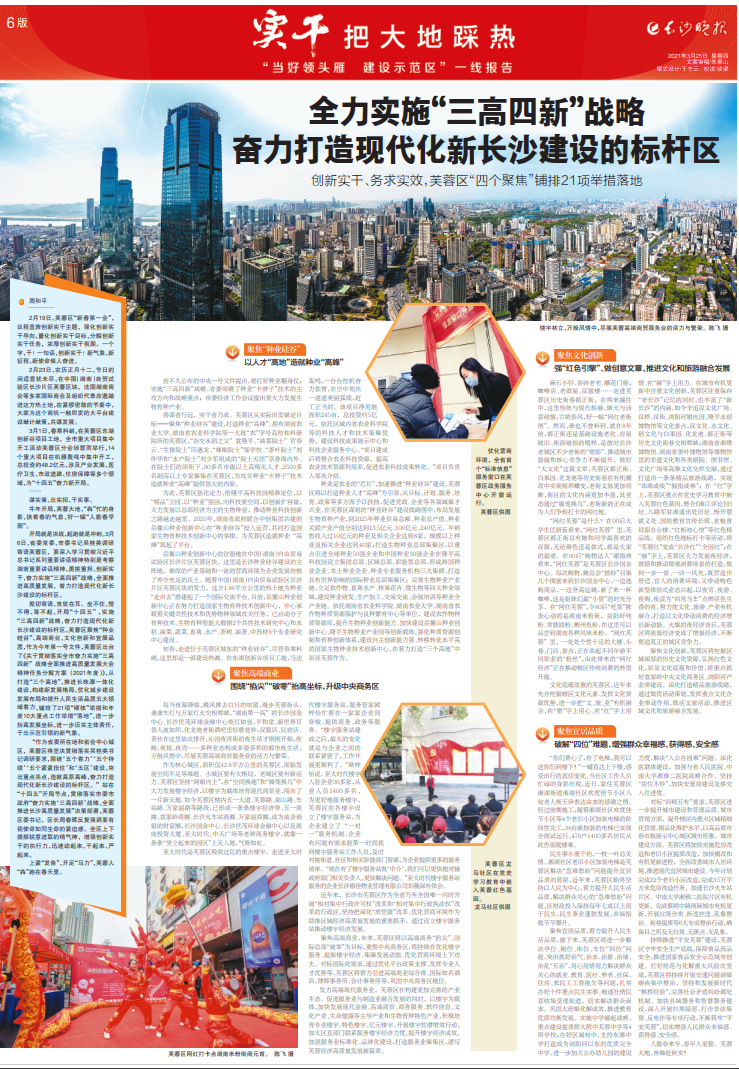殷切寄语,言犹在耳。坐不住、慢不得、等不起,开局“十四五” ,实施“三高四新”战略,奋力打造现代化新长沙建设的标杆区,芙蓉区聚焦“种业硅谷”、高端商业、文化创新和宜居品质,作为今年第一号文件,芙蓉区出台了《关于贯彻落实全市奋力实施“三高四新”战略全面推进高质量发展大会精神任务分解方案(2021年度)》,从打造“三个高地”、推进长株潭一体化建设、构建新发展格局、优化城乡建设发展布局和提升人民生活品质五大领域着力,铺排了21项“硬核”举措和年度10大重点工作举措“落地”,进一步抬高发展坐标,进一步压实主体责任,干出示范引领的新气象。