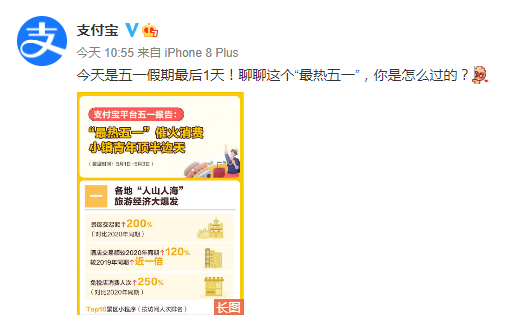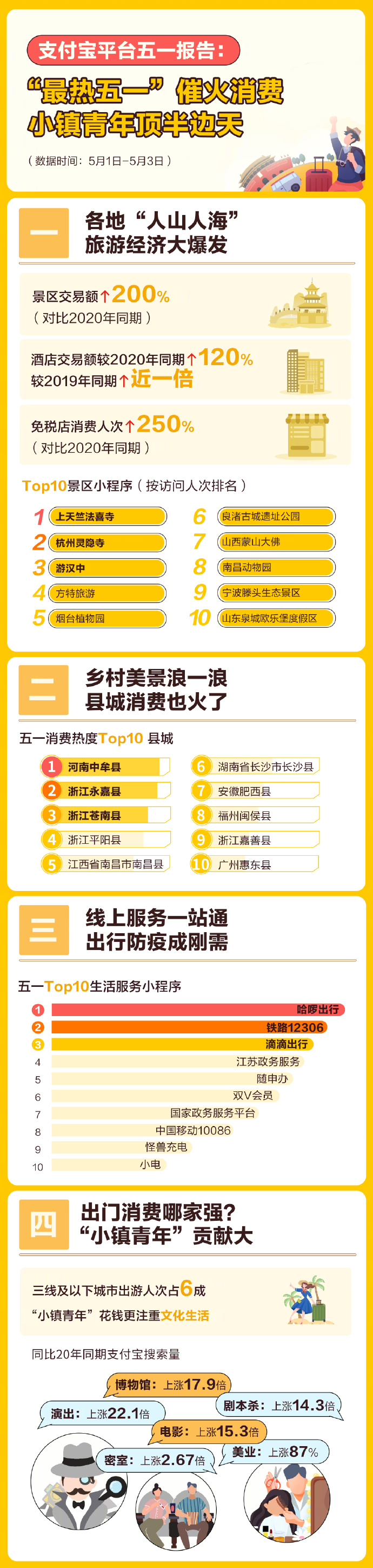 支付宝发布十大最能“买”县城 长沙这个地方上榜-九游网址 稿源:支付宝2021-05-05 17:15 您的浏览器不支持 audio 标签。 5月5日,支付宝平台发布数据报告,五一期间,全国景区交易额较2020年同期上涨200%。店住宿等行业增长翻倍,三四五线的人群出游消费占比近6成。 值得注意的是,在全国十大最能“消费”县城里,长沙县列全国第6位。 这个“最热五一”,你是怎么过的? 【作者:】 【编辑:谭伟】 长沙晚报社九游网址的版权声明 关键词:支付宝 >>我要举报