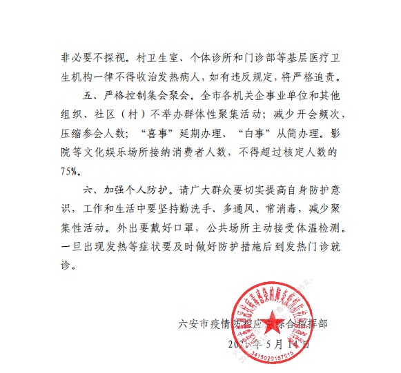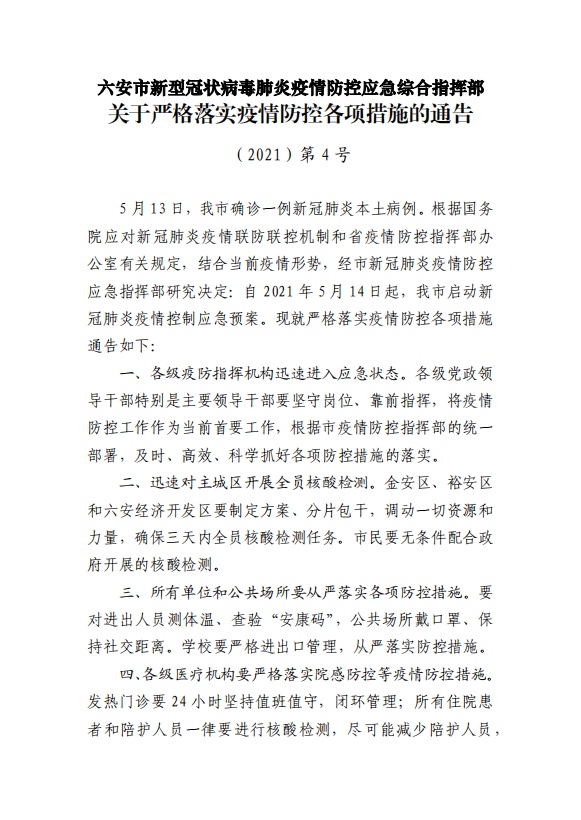 安徽六安:三区确保3天内完成全员核酸检测-九游网址 稿源:央视新闻2021-05-14 8:40 您的浏览器不支持 audio 标签。 记者从安徽省六安市新型冠状病毒肺炎疫情防控应急综合指挥部获悉,根据国务院应对新冠肺炎疫情联防联控机制和省疫情防控指挥部办公室有关规定,结合当前疫情形势,经市新冠肺炎疫情防控应急指挥部研究决定,自2021年5月14日起,六安市启动新冠肺炎疫情控制应急预案。 具体措施通告如下: 【作者:】 【编辑:谭伟】 长沙晚报社九游网址的版权声明 关键词:防疫 安徽>>我要举报