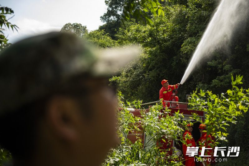 夏季气温高,天气干燥时森林火险等级高。“立新水库森林有烟雾冒出,疑似发生‘火情’,请派人支援!”接到森防指办公室指令后,街道、社区半专业扑火队伍迅速赶赴“火灾”现场,用灭火拖把扑打“山火”;消防车呼啸而至,街道森林消防分队出动,银白色的水柱对准“山火”喷射,“火情”迅速得到控制。