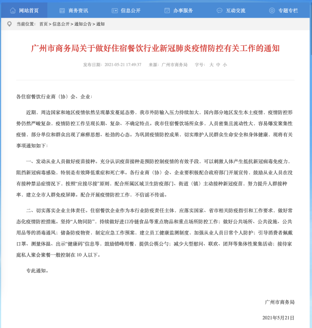 5月21日,广州市商务局发布《广州市商务局关于做好住宿餐饮行业新冠肺炎疫情防控有关工作的通知》。