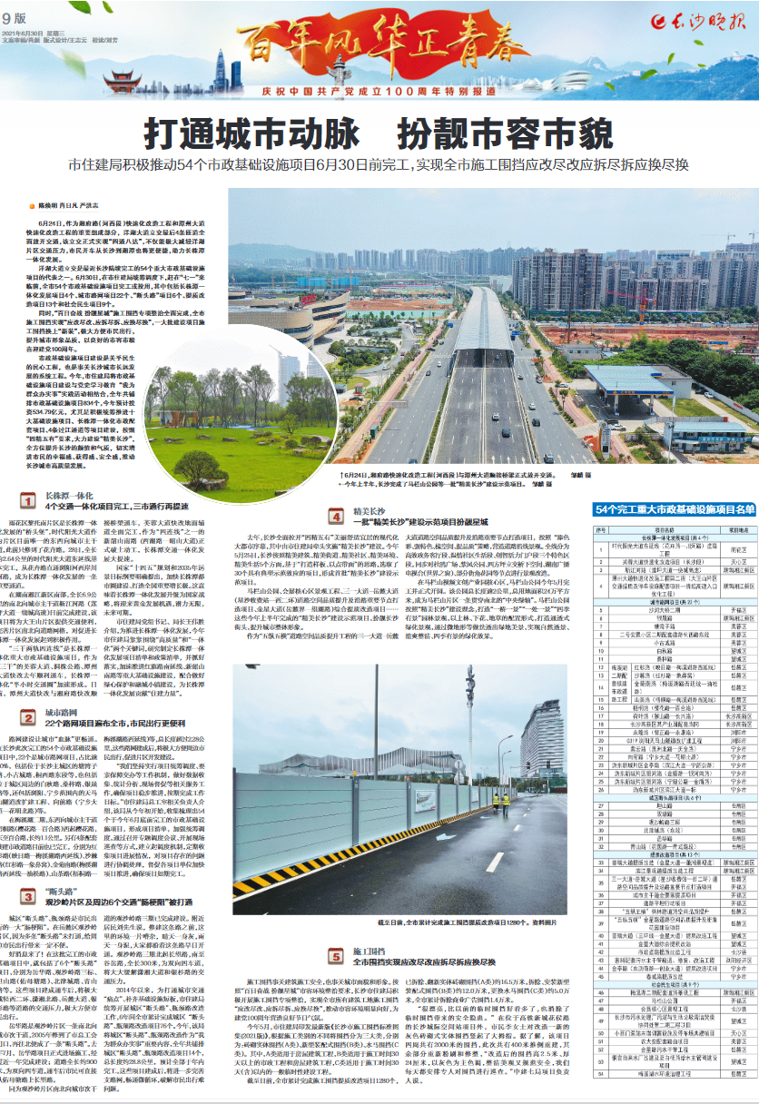 洋湖大道立交是最近长沙陆续完工的54个重大市政基础设施项目的代表之一。6月30日,在市住建局统筹调度下,赶在“七一”来临前,全市54个市政基础设施项目完工或投用,其中包括长株潭一体化发展项目4个、城市路网项目22个、“断头路”项目6个、提质改造项目13个和社会民生项目9个。