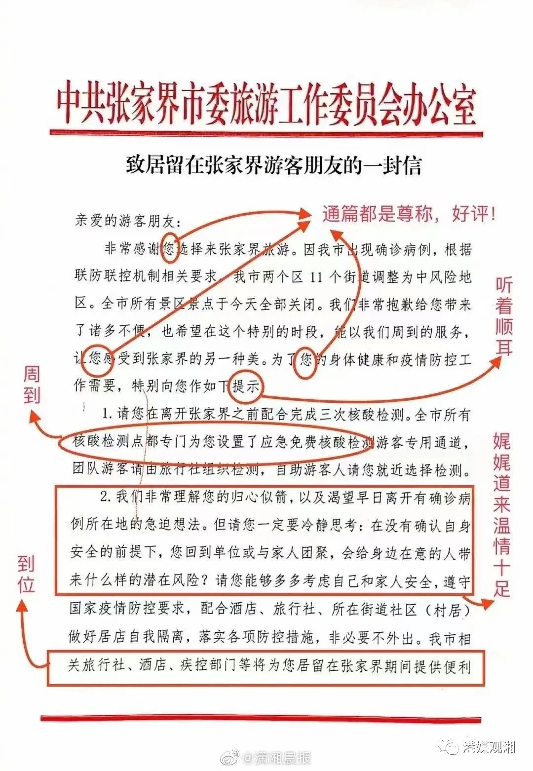 为了不让张家界成为疫情的“中转站”,张家界30日又发出通知,要求游客配合完成三次核酸检测后,才能离开张家界。这份由中共张家界市委旅游工作委员会办公室发布的《致居留在张家界游客朋友的一封信》开始在网上热传,网友纷纷给张家界点赞。