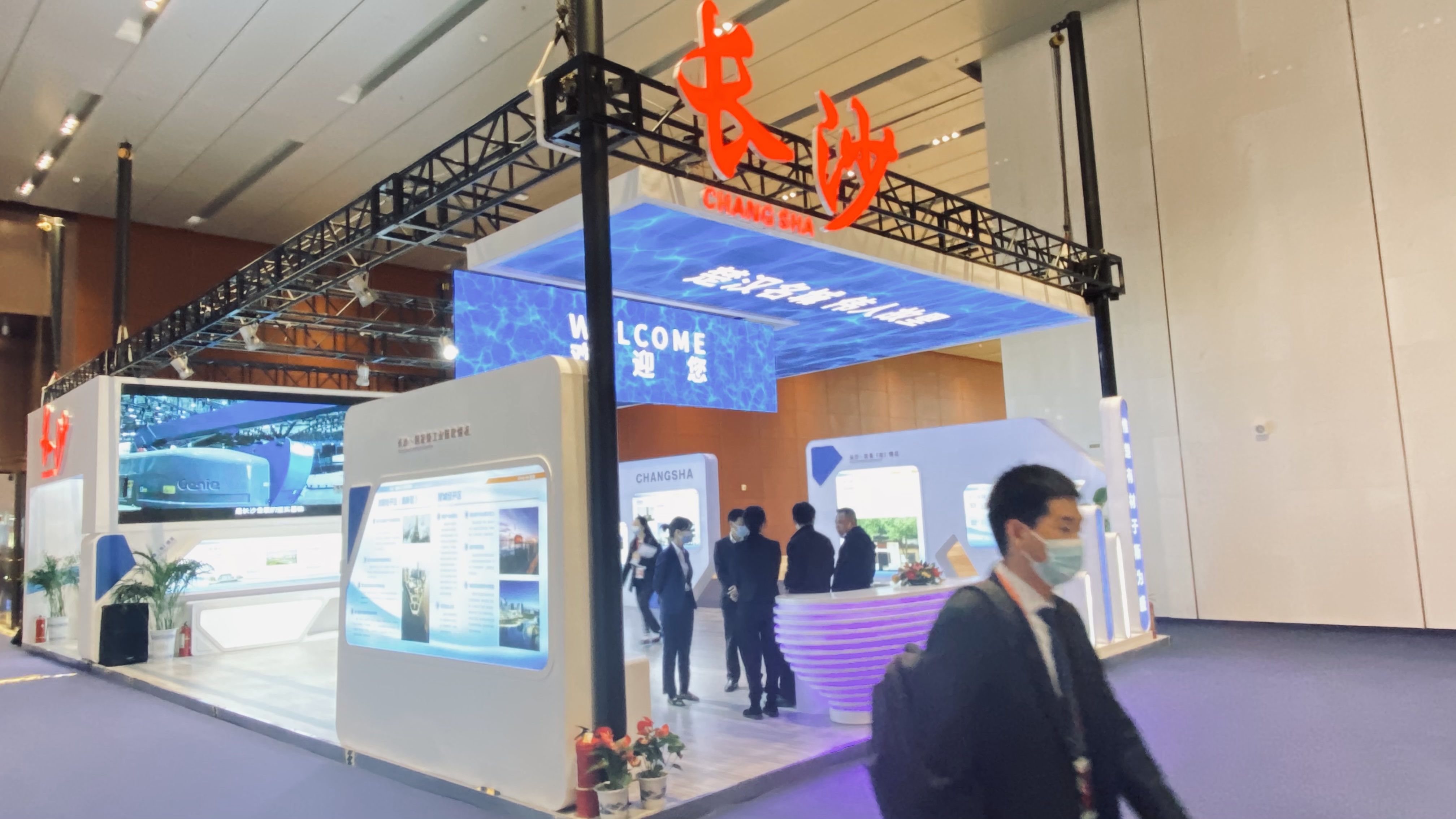 展厅设在长沙国际会议中心一楼,面积有5000平方米。一走进展厅,“楚汉名城 伟人故里欢迎您”几个字,让人感受到浓浓的长沙元素。在这个展区,山水洲城各种要素通过声光和实物凸显出来,红色的元素穿插其中,中国(湖南)自由贸易实验区长沙片区、国家级工业园区、社会事业、民生保障、改革创新等几大版块将长沙发展故事和成就全面展示,将历史文化名城、宜居幸福之城的长沙浓缩在250多平方的展厅里。